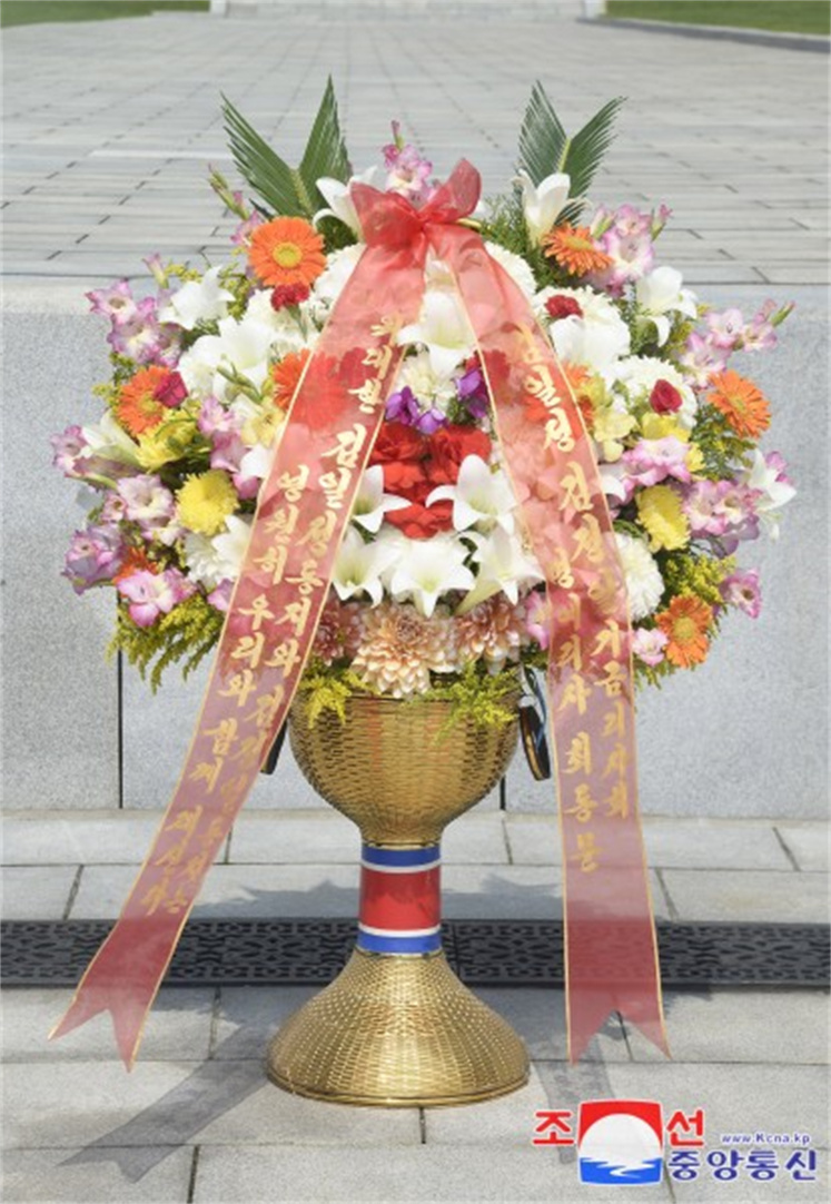 同日,金日成金正日基金理事会名誉副理事长赛铁军名义的花篮也敬献在两位伟人铜像前。