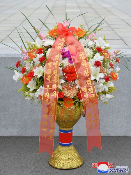 꽃바구니들의 댕기에는 《위대한 김일성동지와 김정일동지는 영원히 우리와 함께 계신다》 등의 글발이 모셔져있었다.
