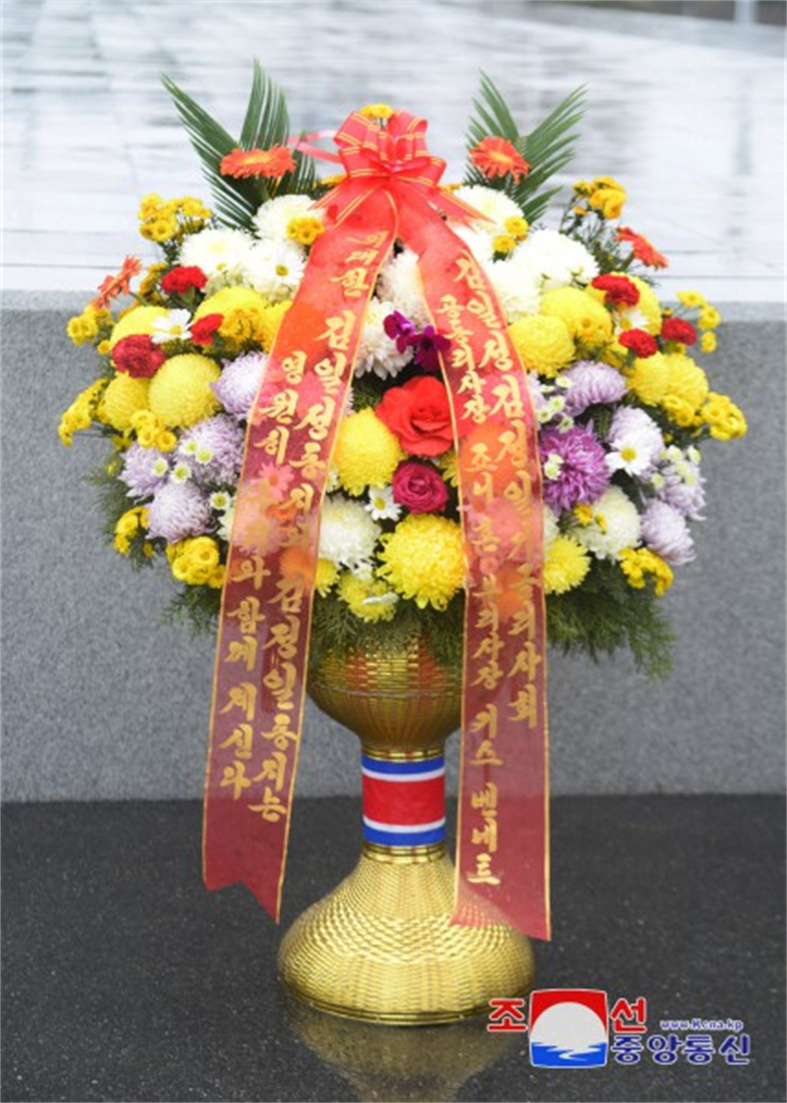 위대한 수령 김일성동지와 위대한 령도자 김정일동지의 동상에 김일성김정일기금리사회 성원들이 꽃바구니를 보내여왔다