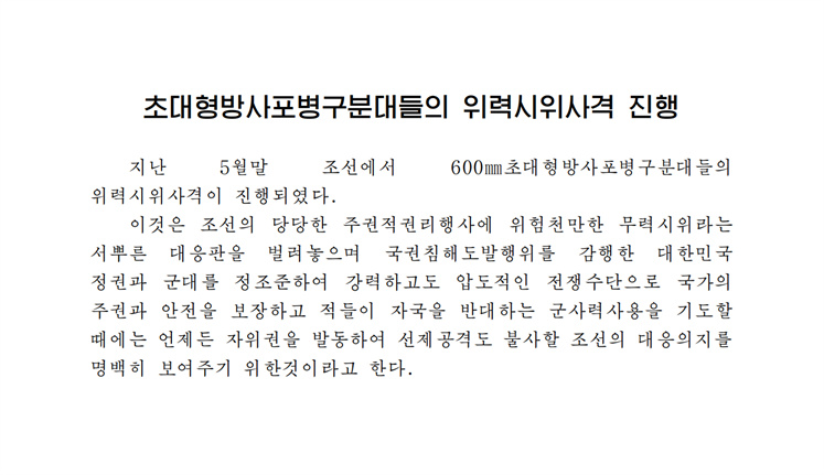 초대형방사포병구분대들의 위력시위사격 진행-조문_00.jpg초대형방사포병구분대들의 위력시위사격 진행-조문_01.jpg초대형방사포병구분대들의 위력시위사격 진행-조문_02.jpg
